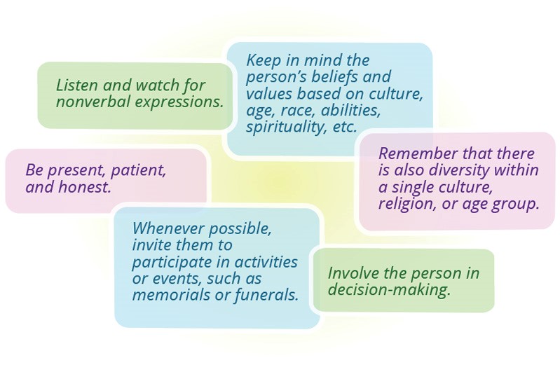 Treat people with respect for their individual abilities and their right to participate in their lives. Provide accurate and honest information, along with support, remembering that you may need to repeat information over time as they process it.