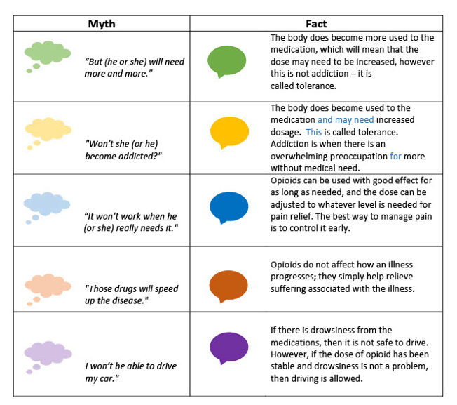 Unfortunately, there are many myths and misunderstandings about opioids that prevent people from having adequate pain control. Each box below contains a concern or a common myth about opioids and a related fact to help dispel the myth.